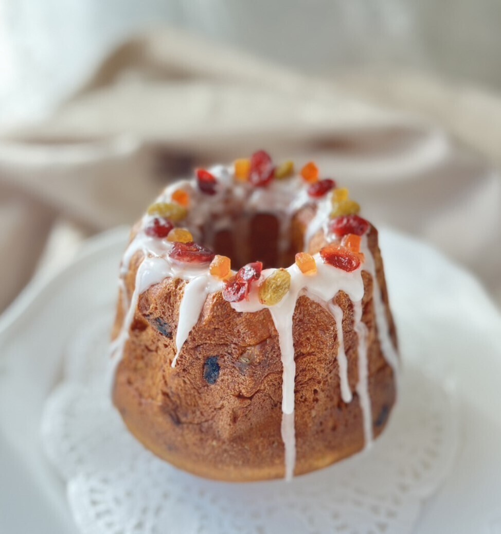 バターと卵たっぷりの生地にドライフルーツが入っています。卵白で作ったマカロン生地をトッピングして焼き上げます。
