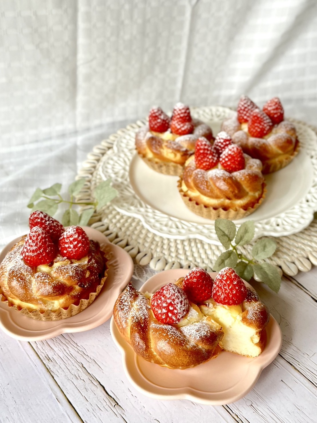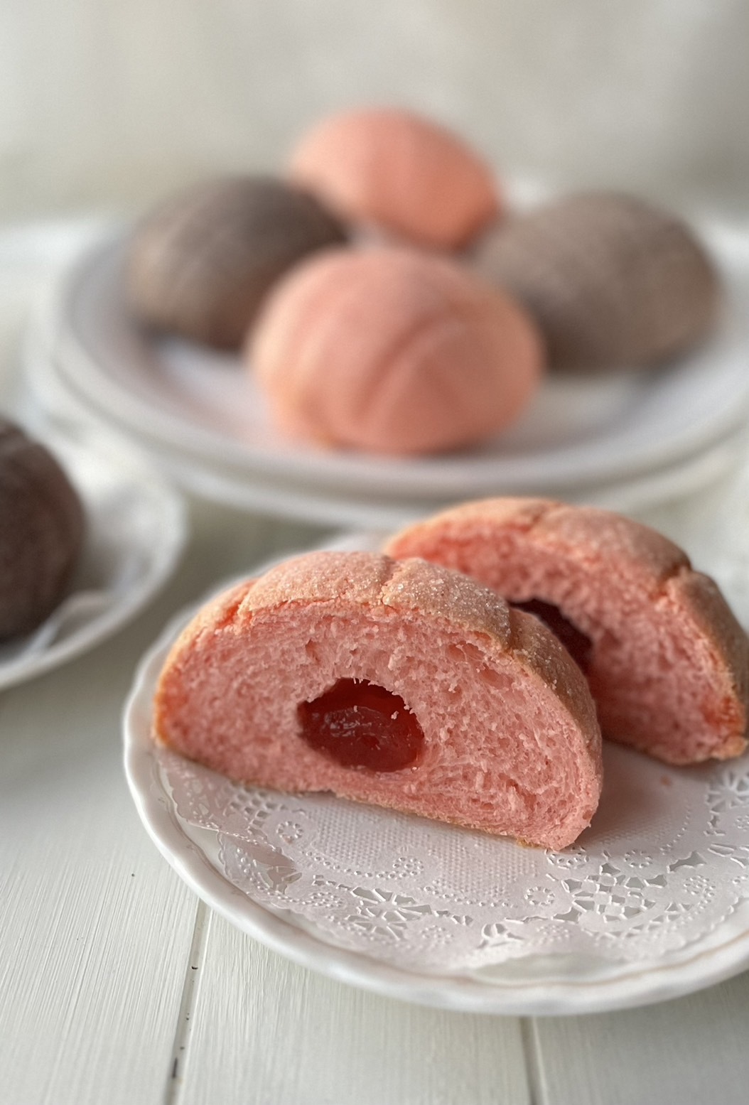いちご果汁入りの生地に、ラズベリー果汁を入れたクッキー生地を乗せました。