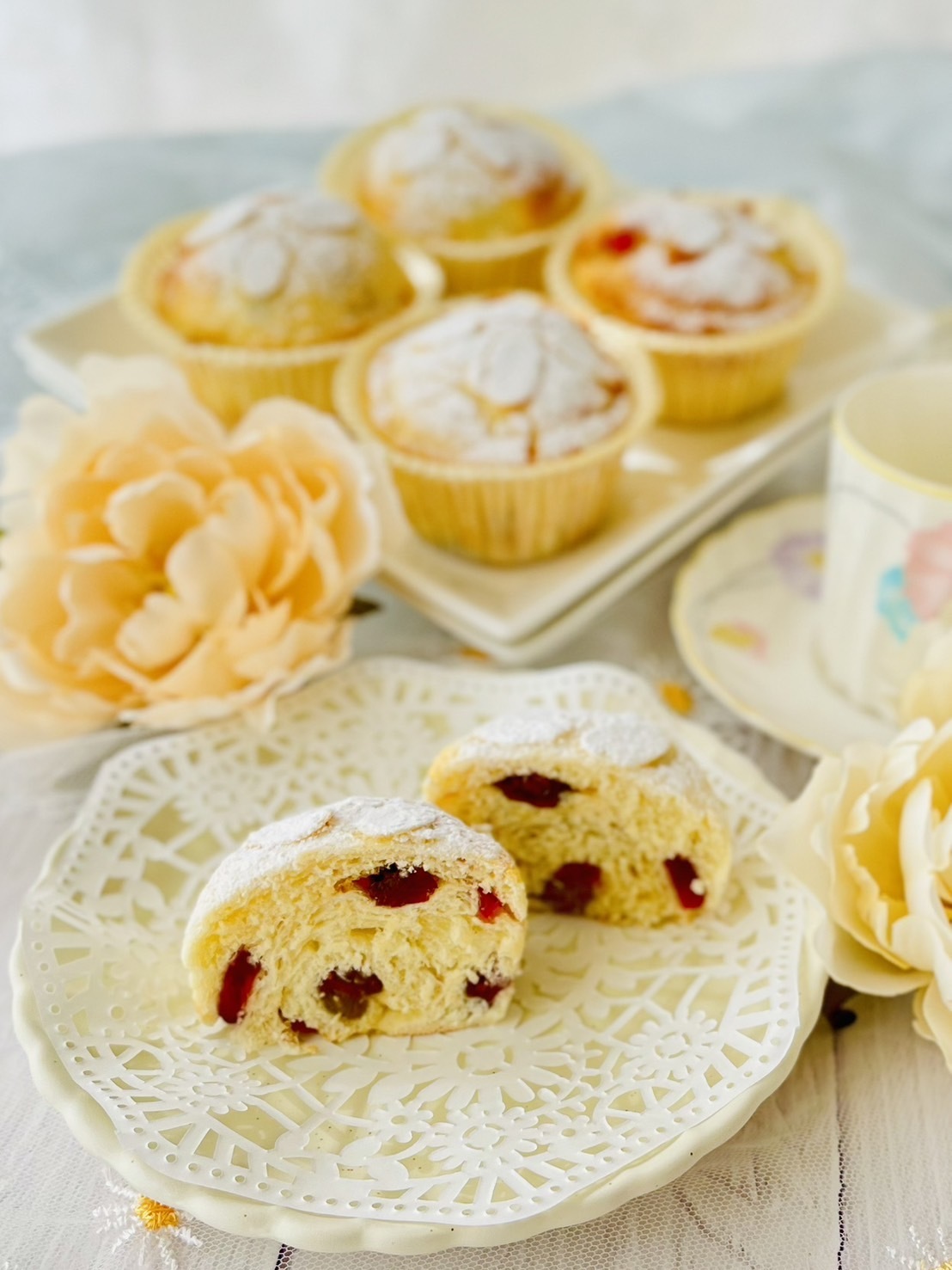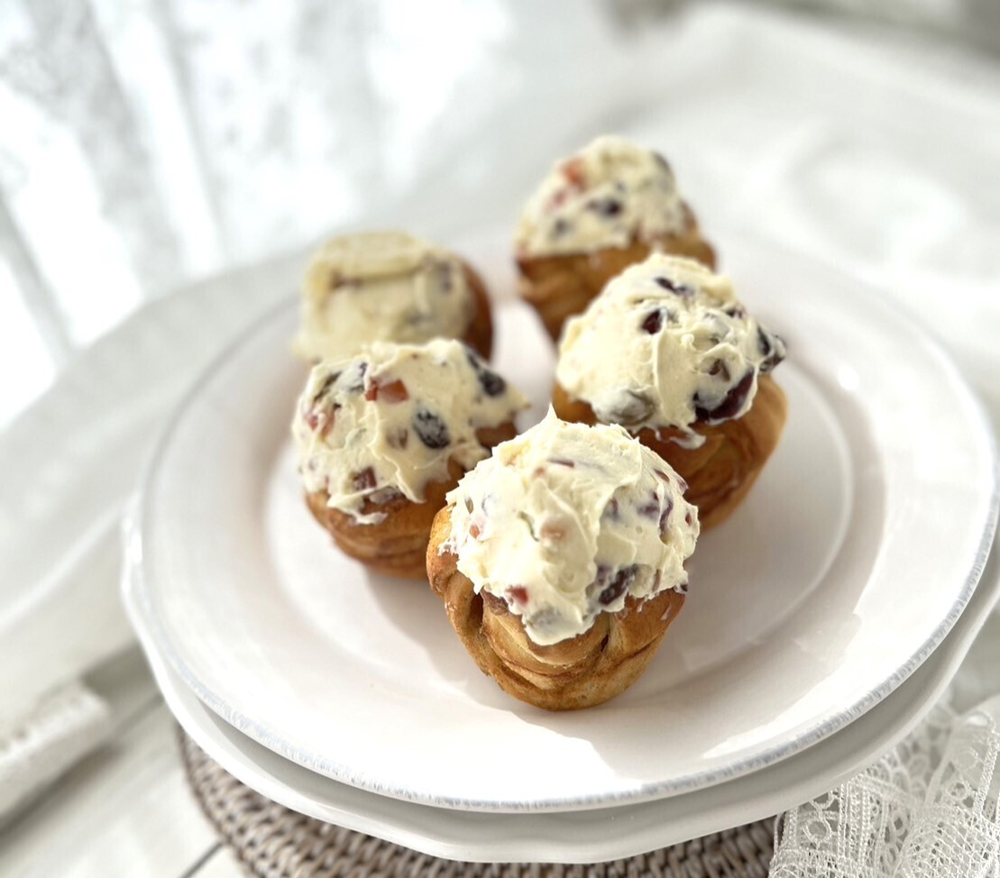 スパイスの女王と言われるカルダモンの香りを効かせてた生地に、ドライフルーツ入りのクリームチーズフォンダンとをたっぷり乗せたカフェメニューの様なパンです。