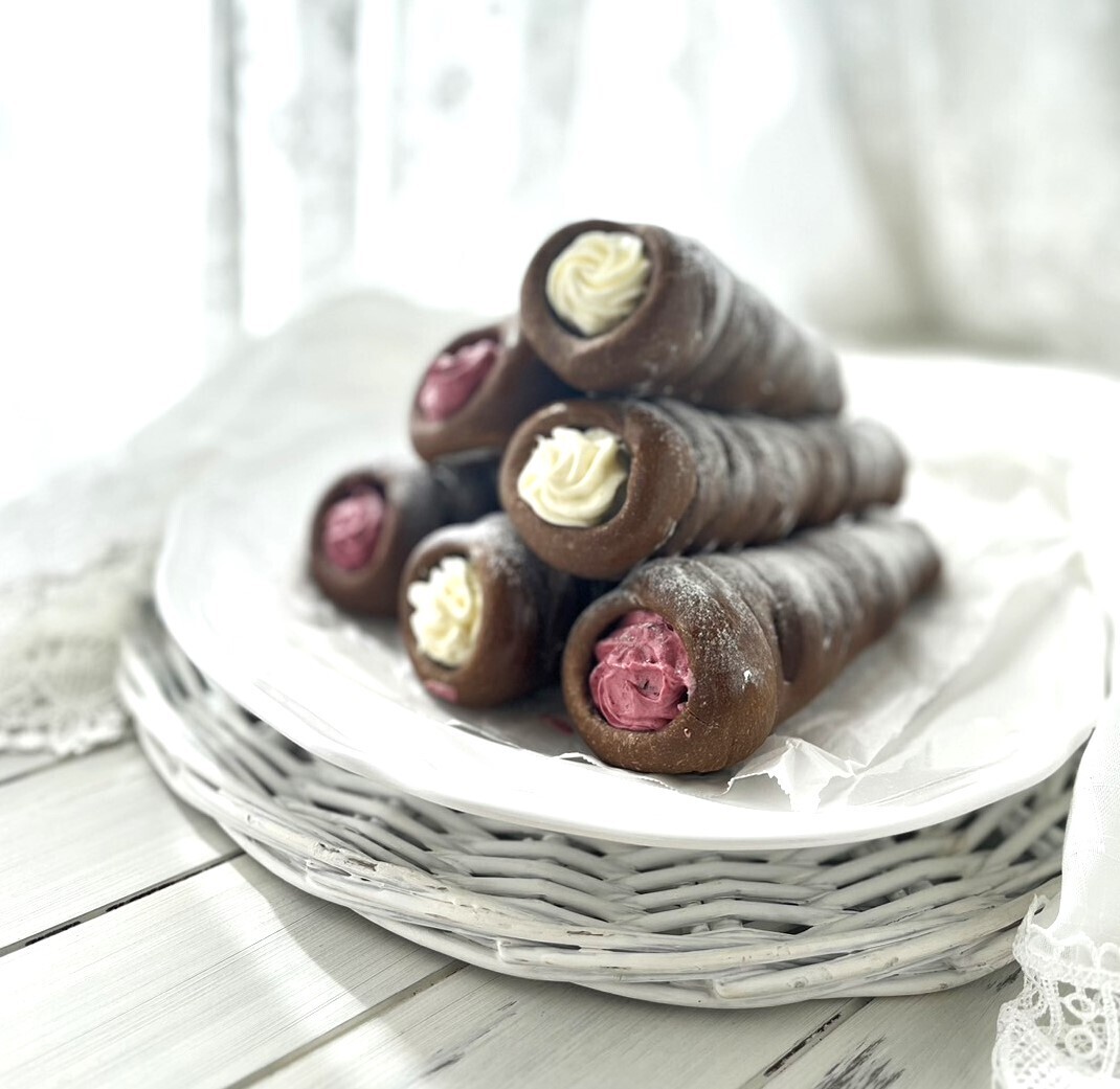ココア入りのコルネ生地に、真っ白いカスタードクリーム、色鮮やかなチェリークリームを 詰めました。