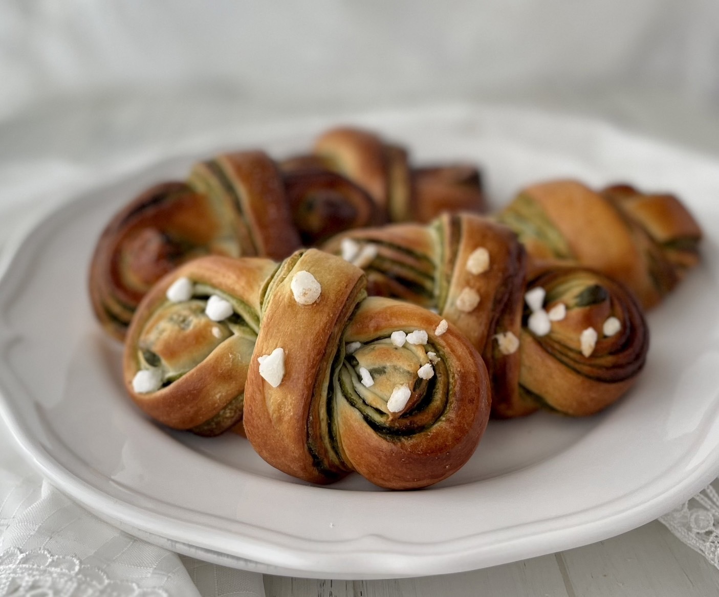 簡単に作れる自家製抹茶シートを折り込みました。 リボンの様な形に成型してあられ糖をトッピング。